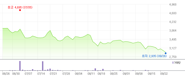 지난 52주간 최고 주가는 5,710원이었고, 52주간 최저 주가는 2,955원이었습니다.