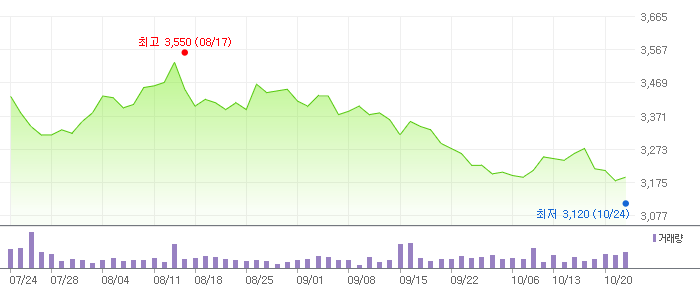 지난 52주간 최고 주가는 3,825원이었고, 52주간 최저 주가는 3,070원이었습니다.