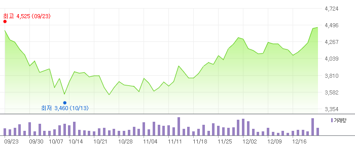 아래는 한화손해보험의 일간, 3개월 주식 변동 차트입니다.