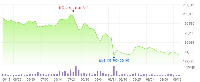 지난 52주간 최고 주가는 299,500원이었고, 52주간 최저 주가는 136,700원이었습니다.