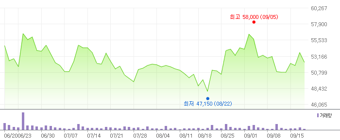 지난 52주간 최고 주가는 58,000원이었고, 52주간 최저 주가는 40,500원이었습니다.