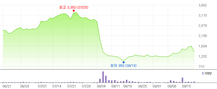 지난 52주간 최고 주가는 3,350원이었고, 52주간 최저 주가는 900원이었습니다.