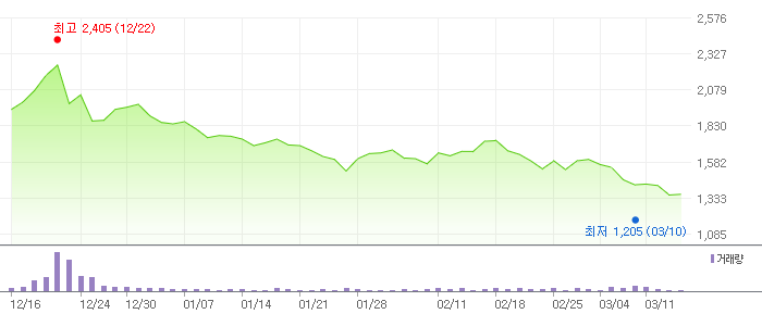 아래는 수성의 일간, 3개월 주식 변동 차트입니다.