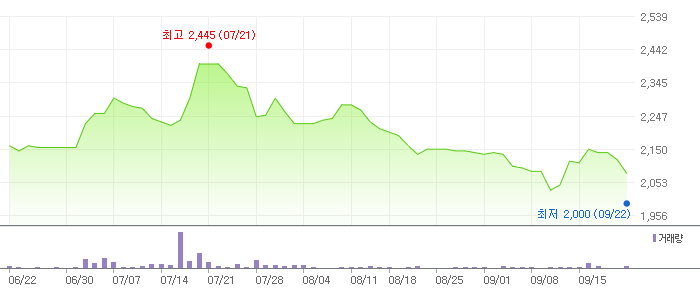 지난 52주간 최고 주가는 2,445원이었고, 52주간 최저 주가는 1,925원이었습니다.