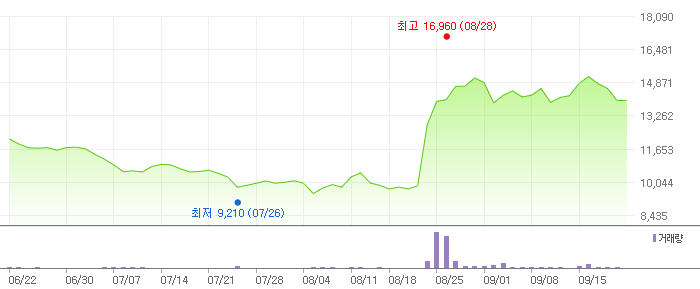 지난 52주간 최고 주가는 16,960원이었고, 52주간 최저 주가는 9,210원이었습니다.